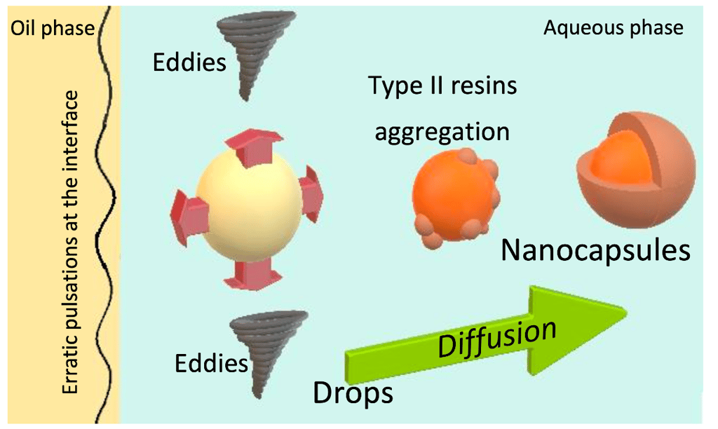 The primary objective of this study is the synthesis of nanocapsules (NC) that allow the reduction of the adsorption process of surfactant over the porous media in enhanced oil recovery processes. Nanocapsules were synthesized through the nanoprecipitation method by encapsulating commercial surfactants Span 20 and Petro 50, and using type II resins isolated from vacuum residue as a shell. The NC were characterized using dynamic light scattering, transmission electron microscopy, Fourier transform infrared, solvency tests, softening point measurements and entrapment efficiency. The obtained NC showed spherical geometry with sizes of 71 and 120 nm for encapsulated Span 20 (NCS20), and Petro 50 surfactant (NCP50), respectively. Also, the NCS20 is composed of 90% of surfactant and 10% of type II resins, while the NCP50 material is 94% of surfactant and 6% of the shell. Nanofluids of nanocapsules dispersed in deionized water were prepared for evaluating the nanofluid—sandstone interaction from adsorption phenomena using a batch-mode method, contact angle measurements, and FTIR analysis. The results showed that NC adsorption was null at the different conditions of temperatures evaluated of 25, 50, and 70◦C, and stirring velocities up to 10,000 rpm. IFT measurements showed a reduction from 18 to 1.62 and 0.15 mN/m for the nanofluids with 10 mg/L of NCS20, and NCP50 materials, respectively. Displacements tests were conducted using a 20◦API crude oil in a quarter five-spot pattern micromodel and showed an additional oil recovery of 23% in comparison with that of waterflooding, with fewer pore volumes injected than when using a dissolved surfactant.