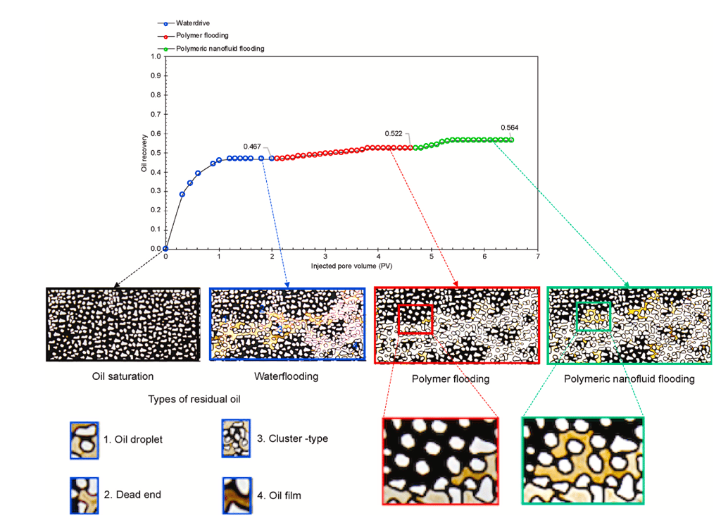 The incorporation of SiO2 nanoparticles in polymer solutions for oil recovery has generated considerable interest in recent research. Although this approach improves the polymer performance, little evidence is available about the recovery mechanisms that intervene in the polymeric nanofluid suspension or polymer nanofluid. Therefore, the purpose of this study is to describe the microscopic and macroscopic mechanisms involved during oil recovery with polymeric nanofluid flooding. Changes in the rheology and capillary forces (contact angle and interfacial tension) in the polymeric solution due to the incorporation of SiO2 nanoparticles were evaluated. Coreflooding tests were made to evaluate the retention, apparent viscosity, and impact on the relative permeability. Finally, macroscopic oil recovery was measured by displacement tests in a quarter 5-spot system, and microscopic displacement was evaluated by a microfluidic test. Results indicated that the conservation of a favorable mobility ratio in polymeric nanofluids along the porous medium is the phenomenon that most impacts macroscopic oil recovery. This behavior was associated with a reduction in loss retention and the conservation of the apparent viscosity in the porous medium. A direct relationship was observed between the concentration of SiO2 nanoparticles and the viscoelastic behavior of the polymer and the water-wet condition on the surface exposed to the nanofluid. Moreover, residual oil distribution in microscopic displacement revealed that the reduction in residual oil mainly originated from the decrease in the size of the oil clusters. Consequently, the evidence suggests that microscopic oil displacement in polymeric nanofluid is attributed to the reduction in the capillary forces and increases in the viscoelastic nature of the polymer. Results in this work indicated that the additional oil recovery obtained by polymeric nanofluid flooding is generated by the improvement of macroscopic recovery mechanisms and the activation of microscopic mechanisms.